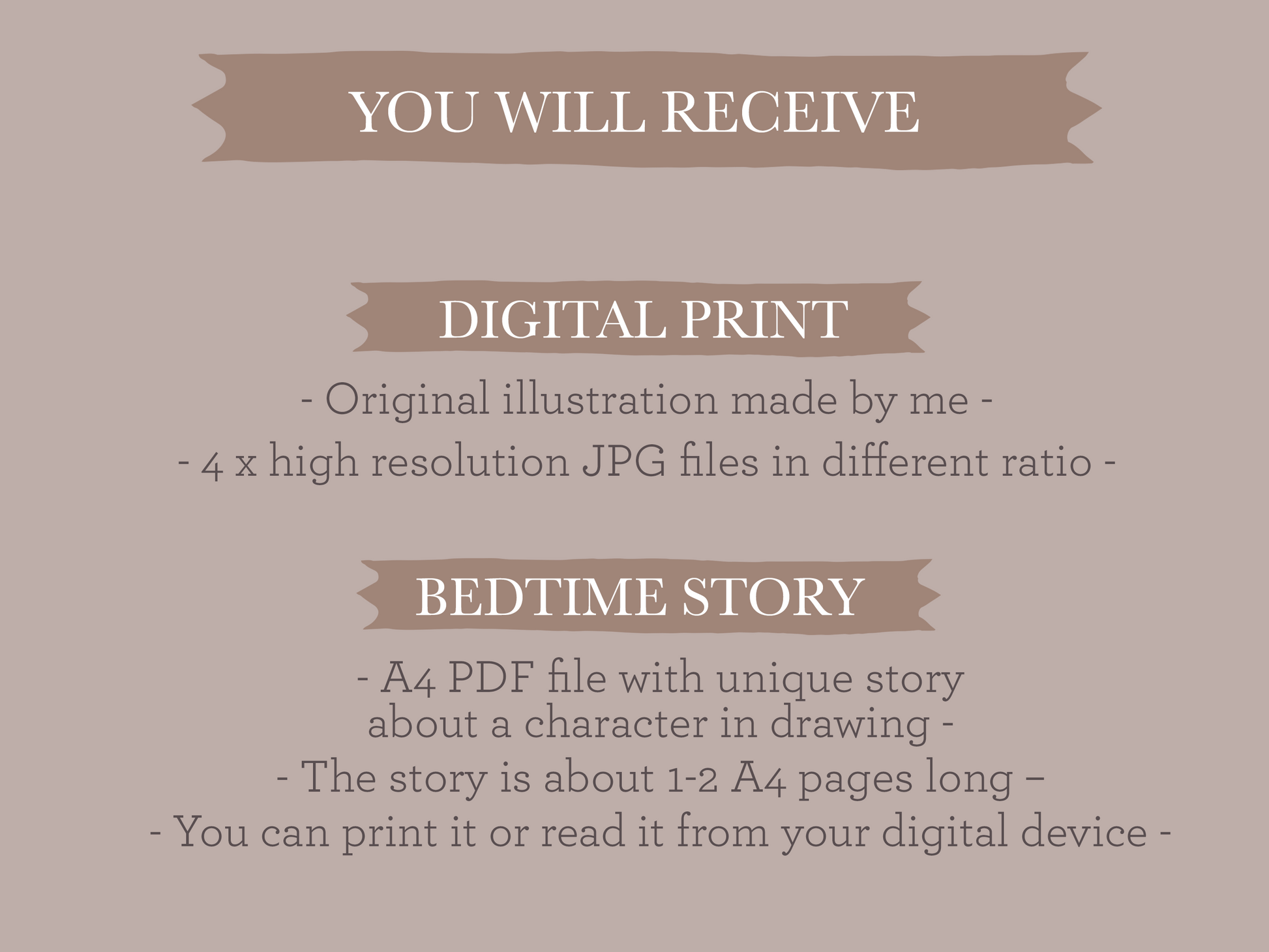 ➤ 1 PDF file with a unique short story about a character in drawing. Story is about 1-2 A4 pages long.